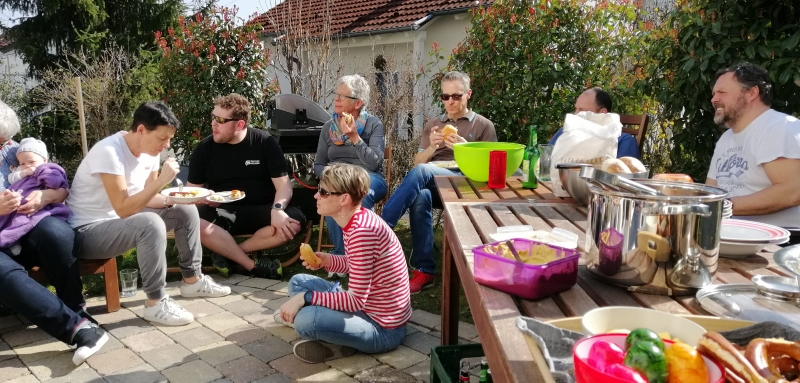 Auch wenn ich mich jetzt sicherlich wiederhole, aber unsere Dankbarkeit für so ein geniales und wild zusammengewürfeltes Umzugsteam ist unbeschreiblich. Erst muss man Hilfe Anbietenden absagen und dann stemmt dieses verbleibende Team den Umzug in einer sagenhaften Zeit. 9:00 Treffpunkt -> 14:10Uhr Grillparty im Garten mit originalen Thüringer und zweierlei Mega-Kartoffelsalaten (Da läuft mir schon wieder das Wasser im Mund zusammen). Vesperpause um 11:45 zwischen Ausräumen und Transport sowie Ausladen und Aufbau aller Schränke.